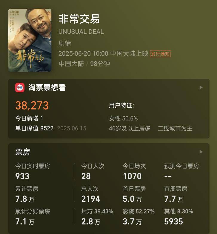 6月下旬,当《酱园弄》横扫票房,狂揽过亿,以致压过了好莱坞大片《新·驯龙妙手》时,左右的《相称交往》却在阅历一场近乎“玄幻”的公开处刑:这部耗资近亿打造的电影,在上映的首日仅收货5万元票房,次日更是惨淡至1.5万元,不雅影东谈主次总额不到500东谈主。 欺诈