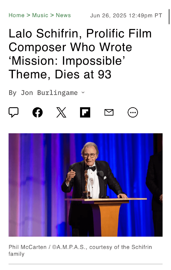 这位阿根廷音乐家是最早将粗鄙的音乐理念哄骗于电影和电视配乐的东谈主之一,熟谙从爵士乐和摇滚乐到更当代和复杂的管弦乐创作妙技。 拉罗·斯王人弗林是《碟中谍》系列电影经典片头音乐的创作家,该曲以其独有的5/4拍节律和悬疑感成为谍战电影的里程碑式配乐,来自于1966年的剧集《虎胆妙算》。 www.sucxi.com